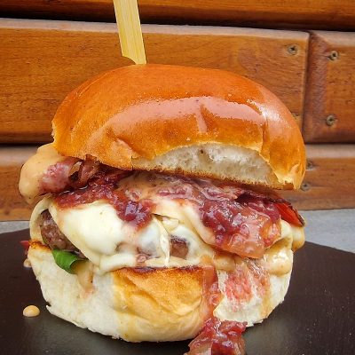 Domáca žemľa, 100% hovädzie mäso, udená sweet BBQ,domáca majonéza, polníček, grilovaný camembert, grilovaná slanina / 1,3,7,10 /